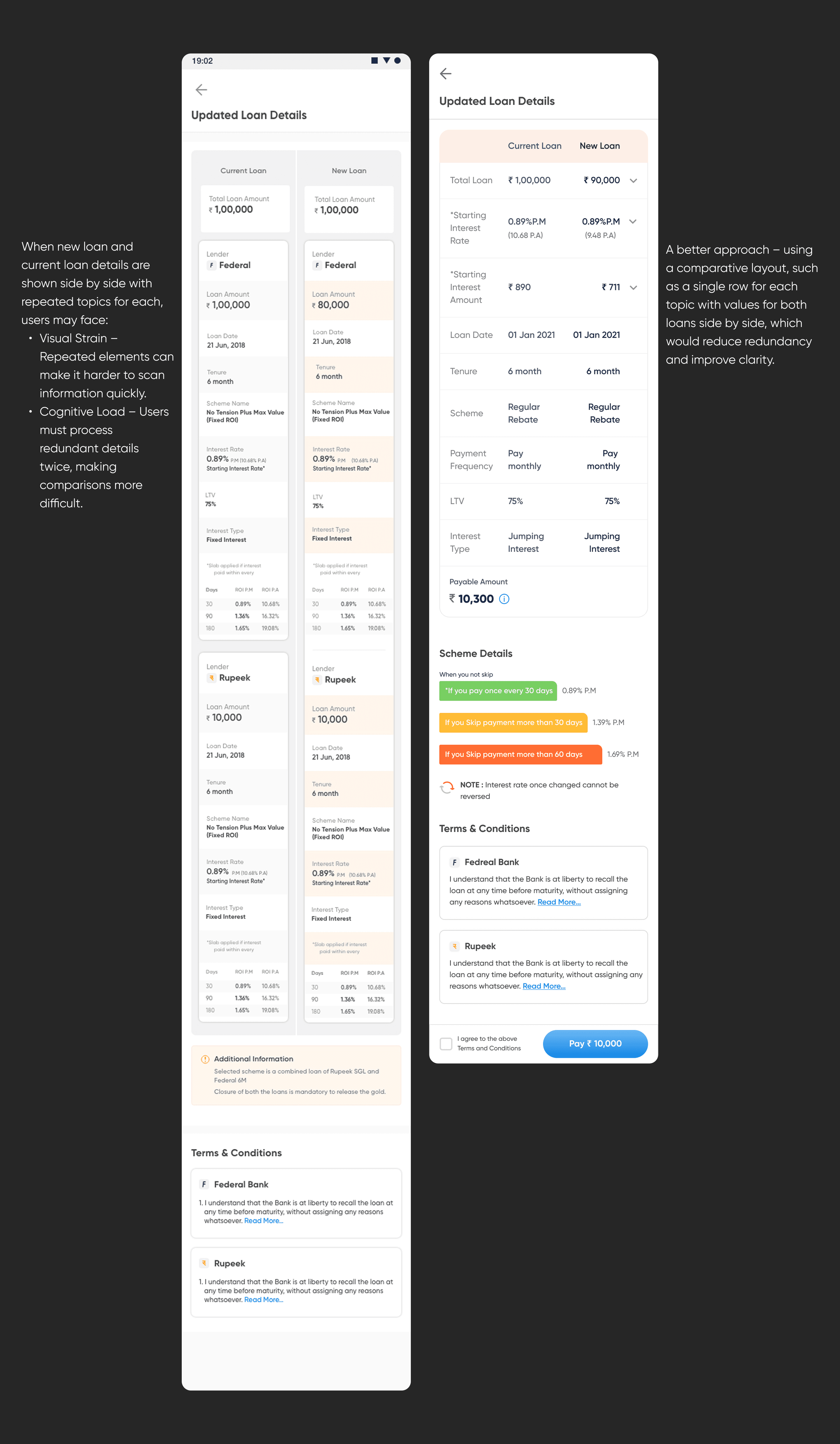 This page helps you clearly understand how your loan changes after renewal by comparing your current loan with the renewed loan—side by side.